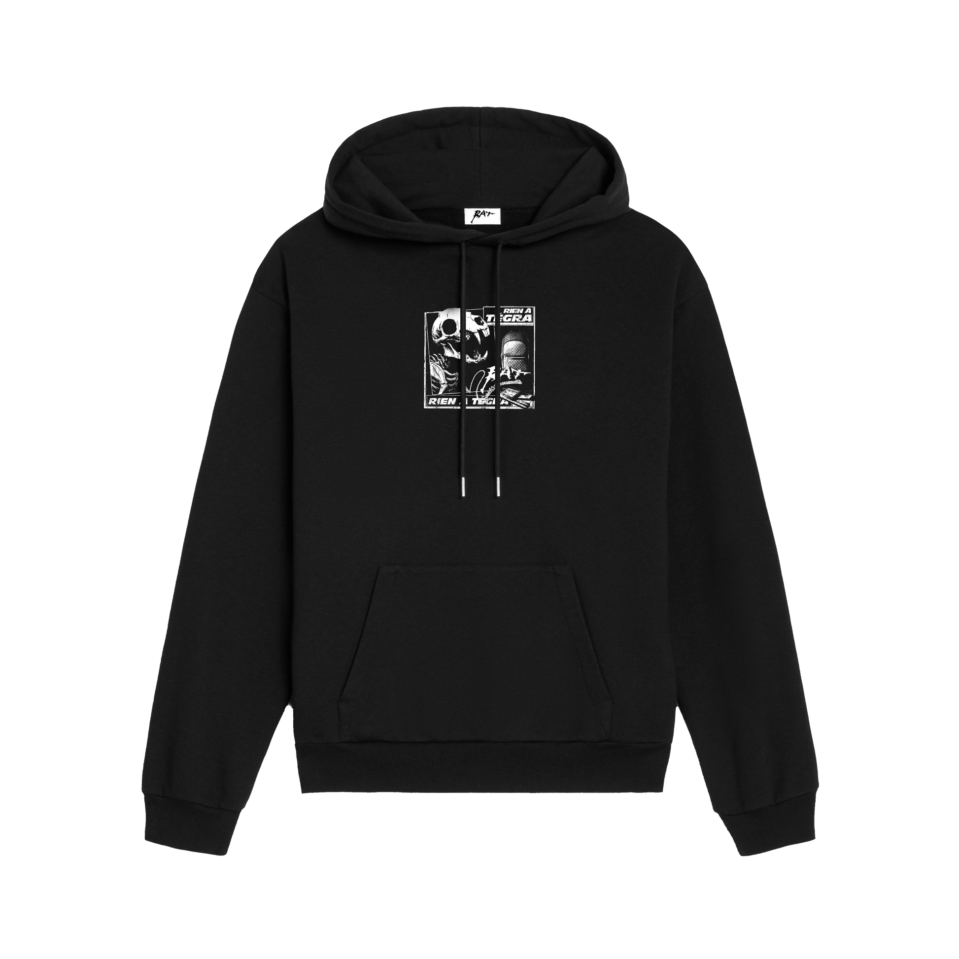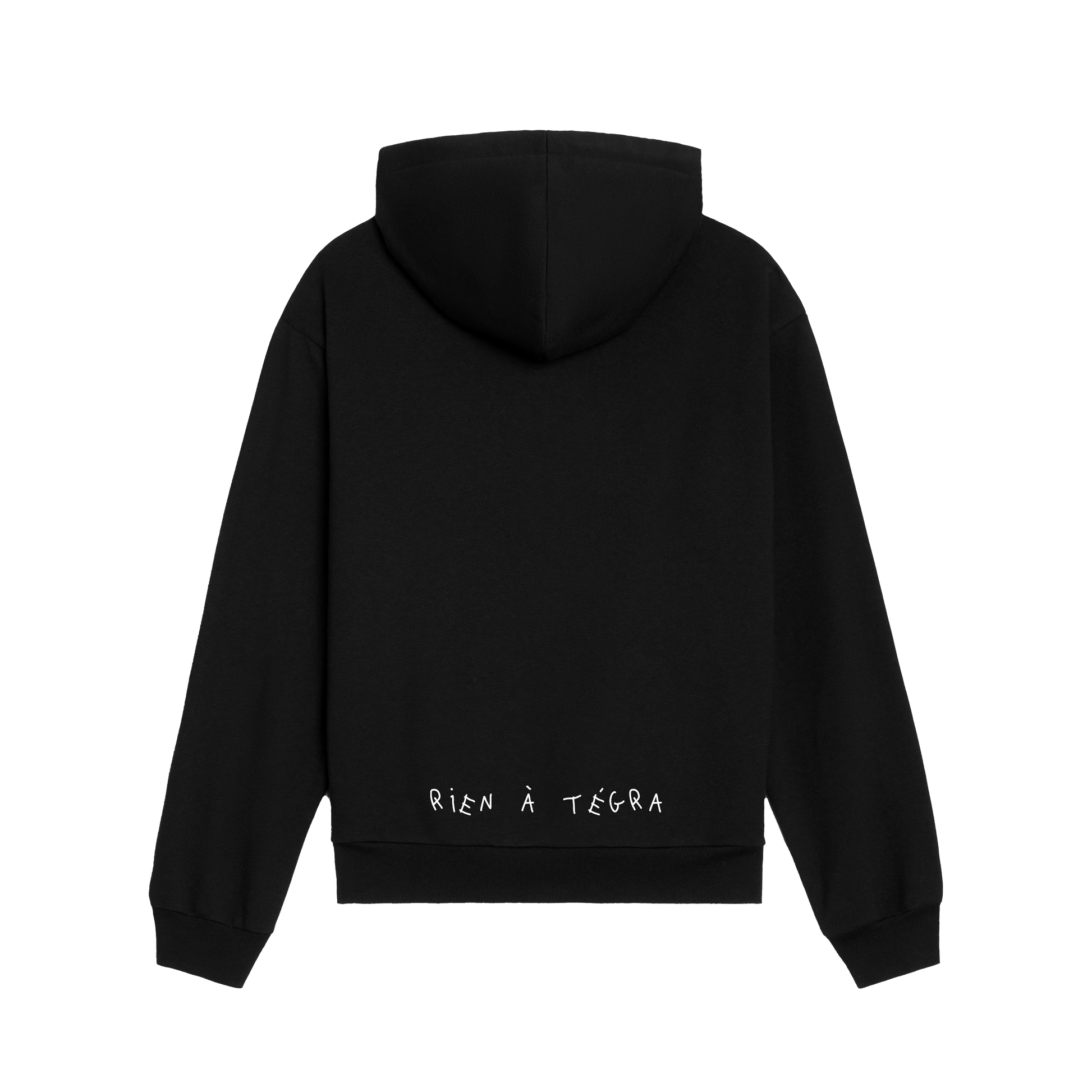 Hoodie noir avec visuel violet mâchoire sertie du grillz “RAT”. Détail signature “Rien à Tégra” au dos en bas.