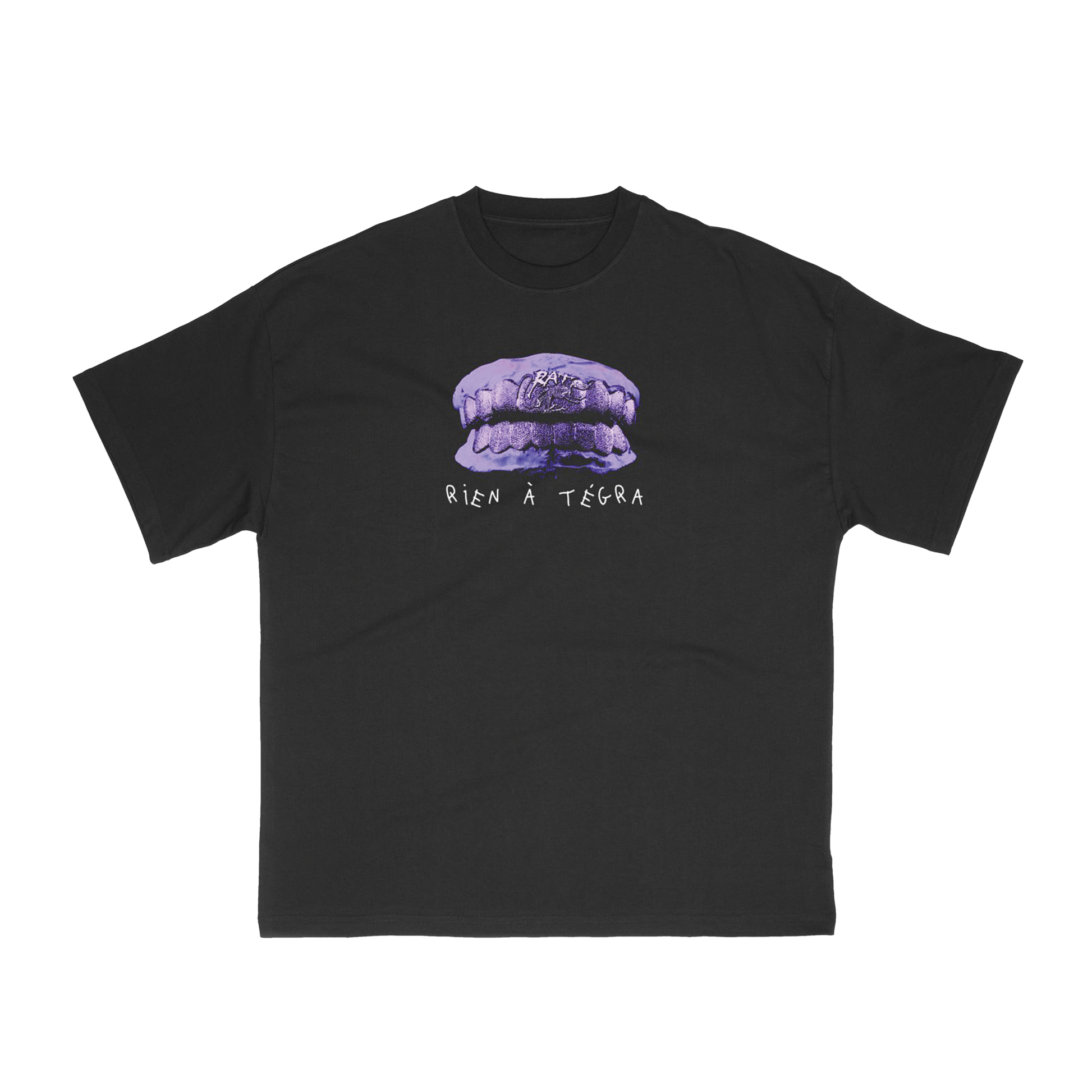 T-shirt noir avec visuel violet mâchoire sertie du grillz “RAT”. Détail signature “Rien à Tégra” au dos en bas.